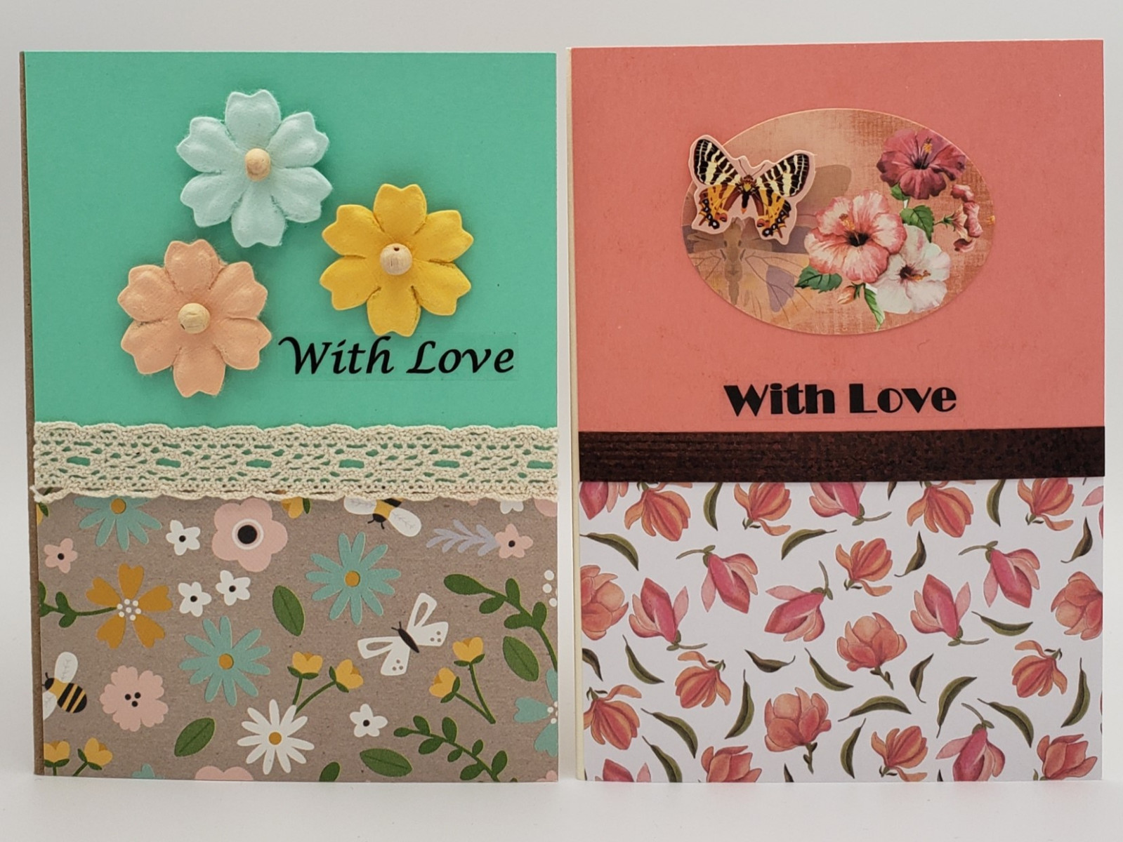 Cards by Crafted Paper Designs feature a mix of prints and solids on white (most common), cream, light pink, light blue, red, kraft or silver card. Our cards have unique decorations made of cardstock, chipboard, paper, wax, jewels, and other materials to create quality designs for every occasion. Included with every card is a matching envelope (based on card colour) and envelope seal. If needed, a card protector is also provided.