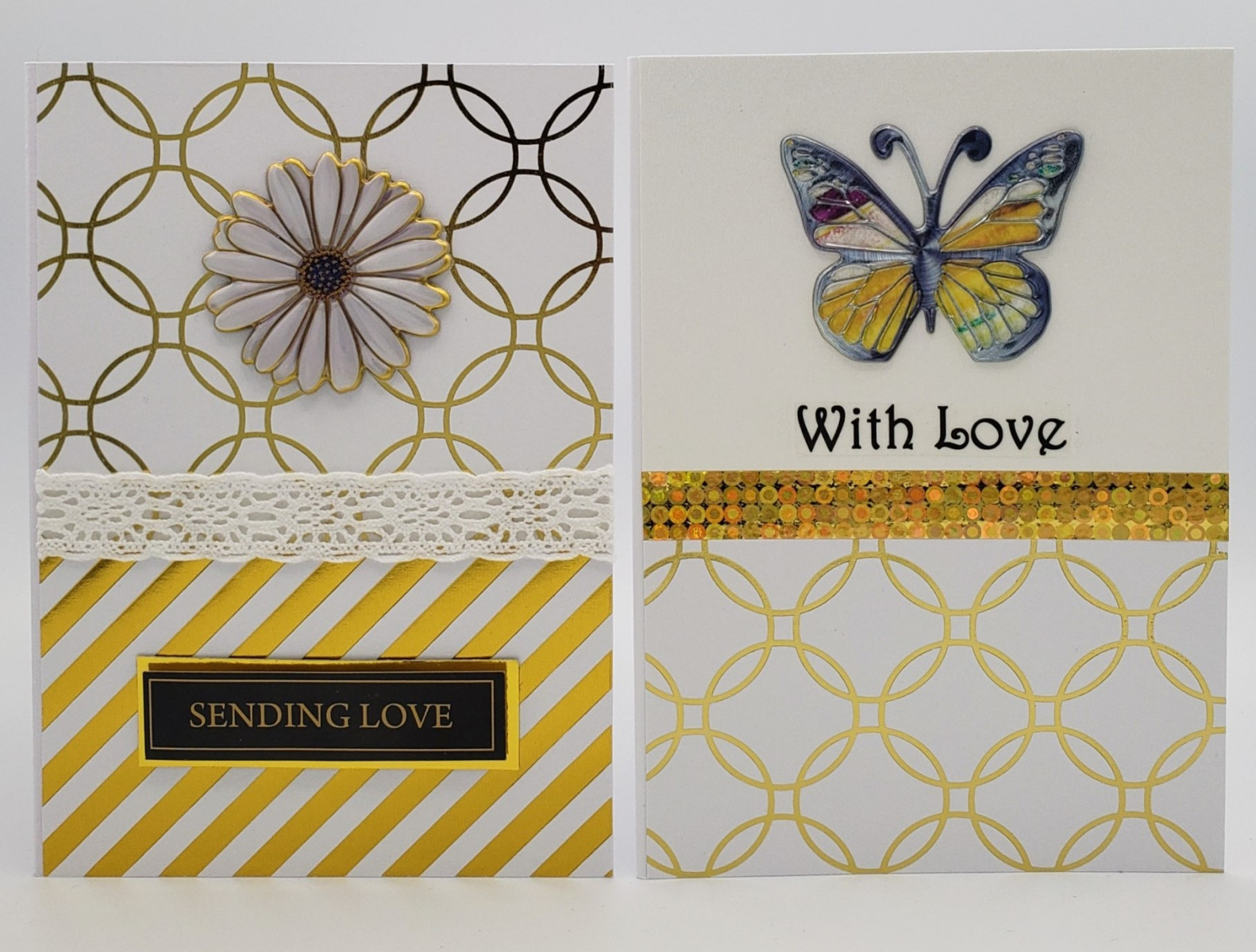 Cards by Crafted Paper Designs feature a mix of prints and solids on white (most common), cream, light pink, light blue, red, kraft or silver card. Our cards have unique decorations made of cardstock, chipboard, paper, wax, jewels, and other materials to create quality designs for every occasion. Included with every card is a matching envelope (based on card colour) and envelope seal. If needed, a card protector is also provided.