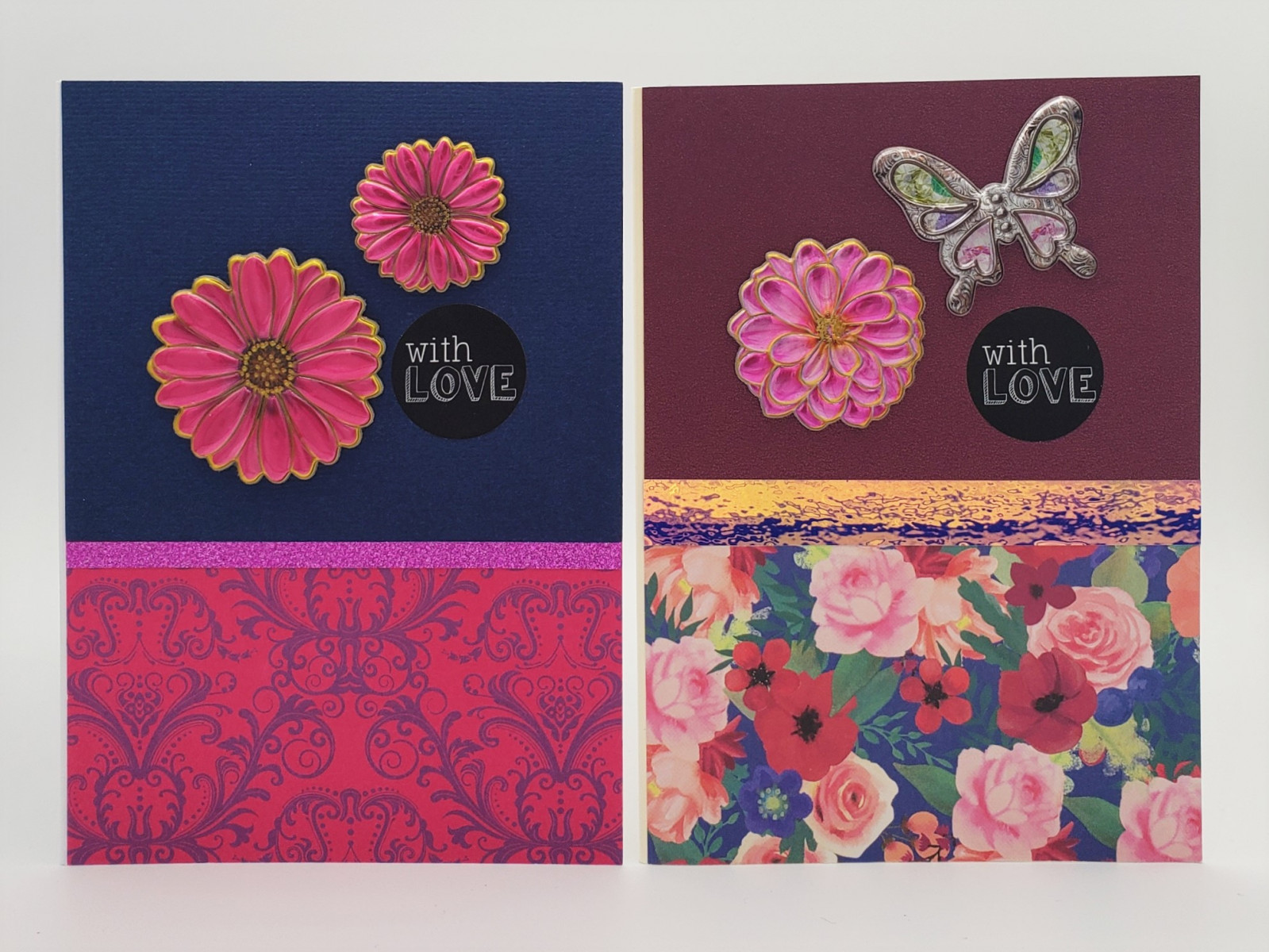 Cards by Crafted Paper Designs feature a mix of prints and solids on white (most common), cream, light pink, light blue, red, kraft or silver card. Our cards have unique decorations made of cardstock, chipboard, paper, wax, jewels, and other materials to create quality designs for every occasion. Included with every card is a matching envelope (based on card colour) and envelope seal. If needed, a card protector is also provided.