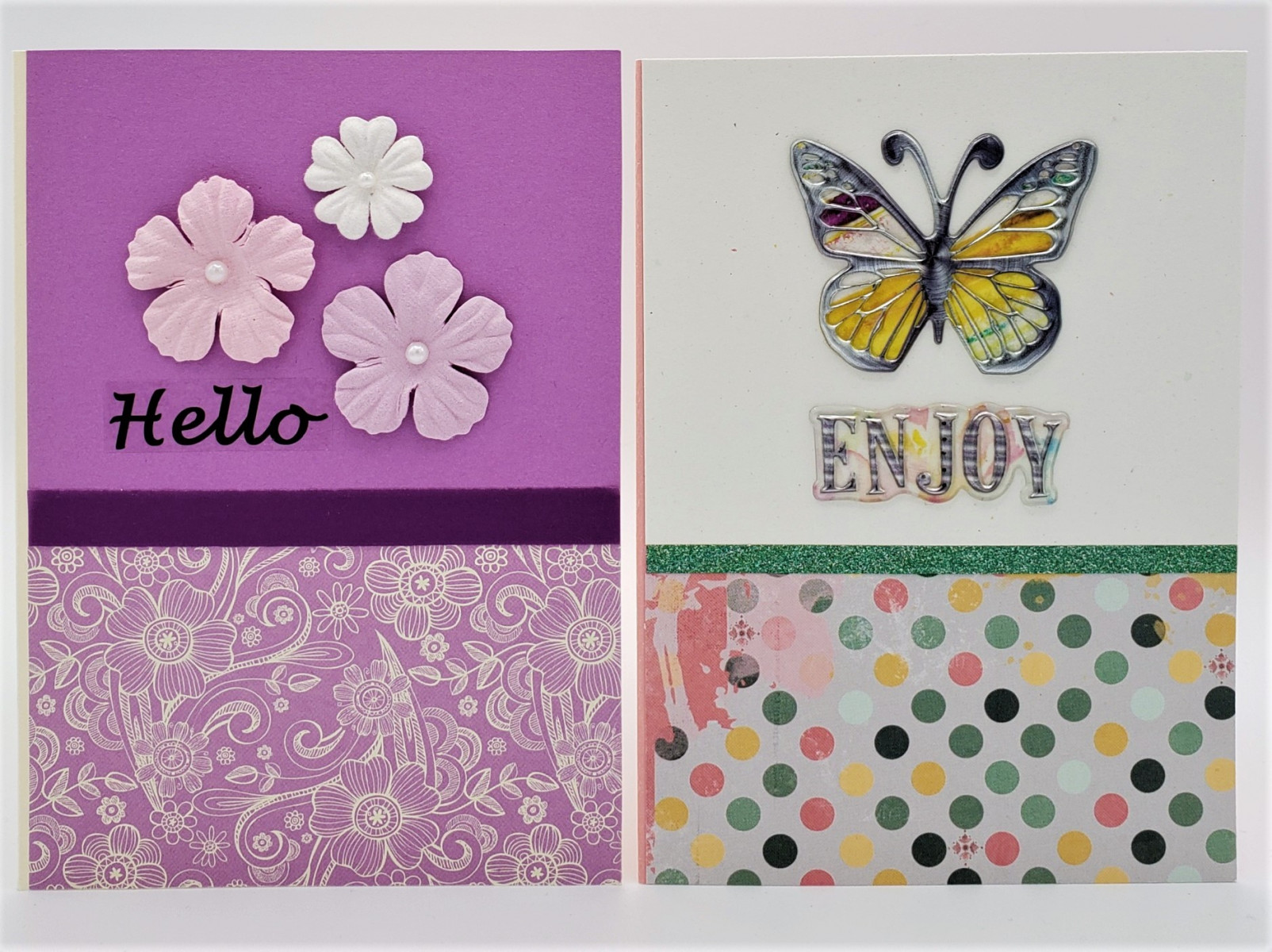 Cards by Crafted Paper Designs feature a mix of prints and solids on white (most common), cream, light pink, light blue, red, kraft or silver card. Our cards have unique decorations made of cardstock, chipboard, paper, wax, jewels, and other materials to create quality designs for every occasion. Included with every card is a matching envelope (based on card colour) and envelope seal. If needed, a card protector is also provided.