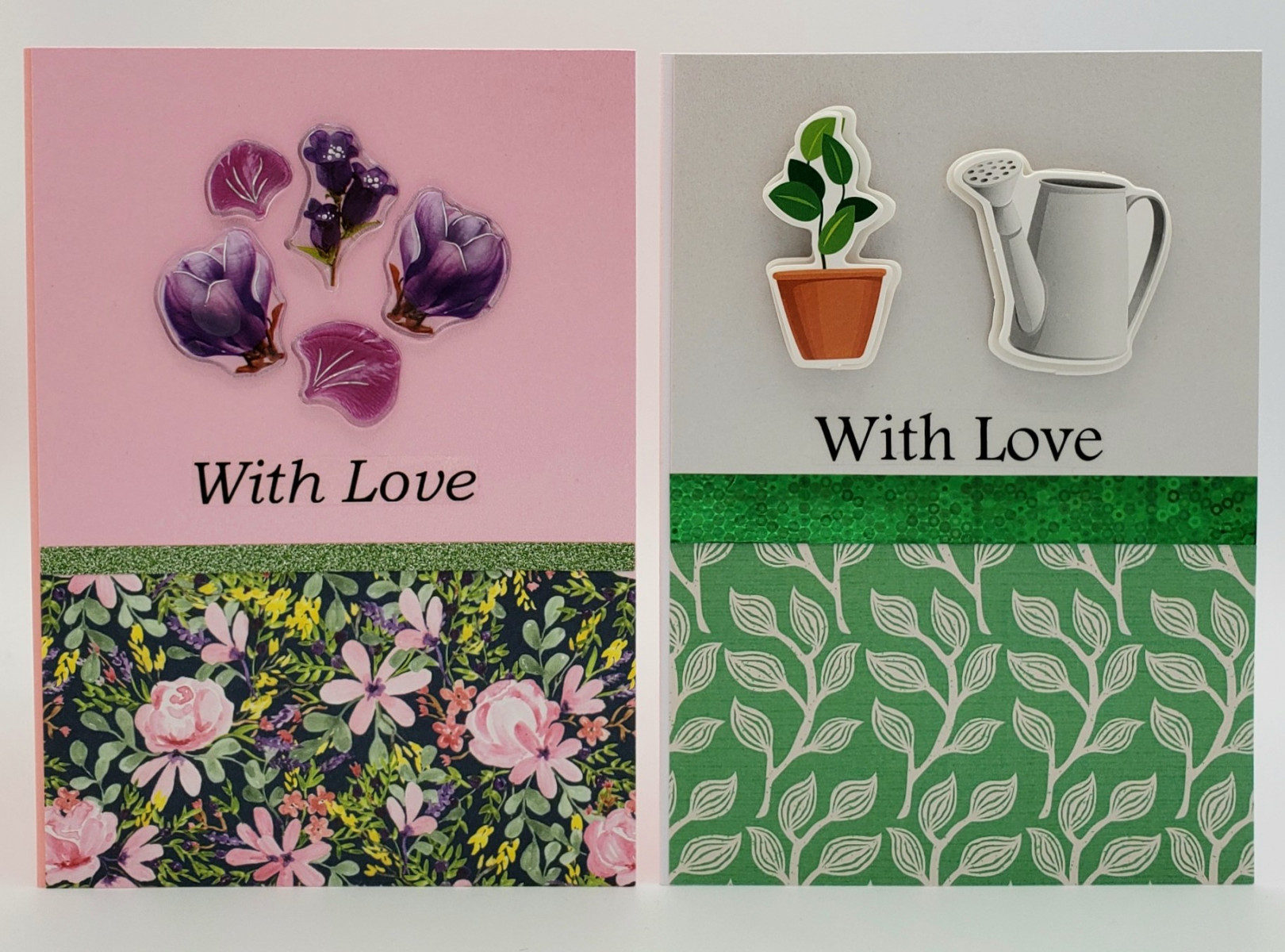 Cards by Crafted Paper Designs feature a mix of prints and solids on white (most common), cream, light pink, light blue, red, kraft or silver card. Our cards have unique decorations made of cardstock, chipboard, paper, wax, jewels, and other materials to create quality designs for every occasion. Included with every card is a matching envelope (based on card colour) and envelope seal. If needed, a card protector is also provided.