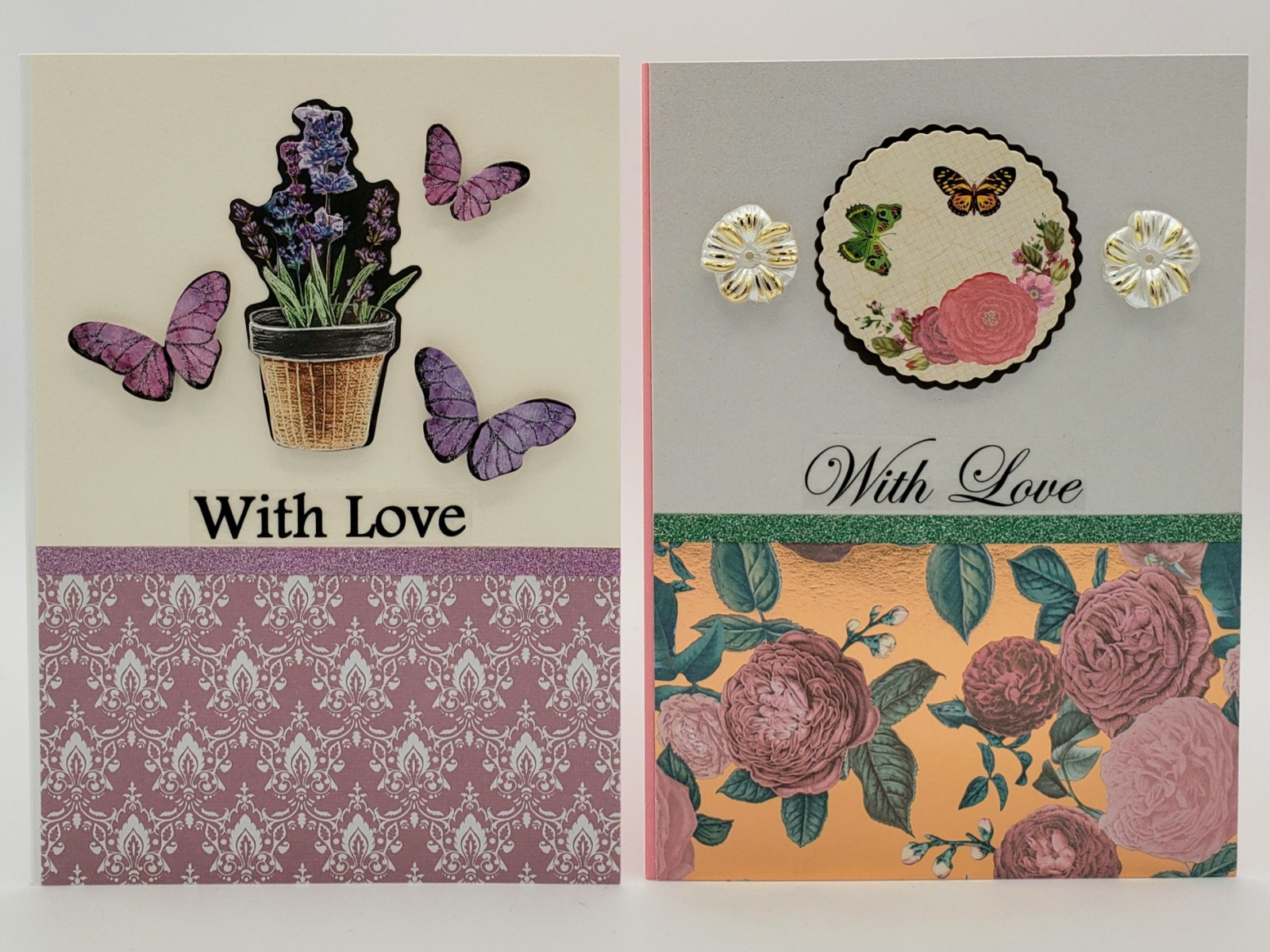 Cards by Crafted Paper Designs feature a mix of prints and solids on white (most common), cream, light pink, light blue, red, kraft or silver card. Our cards have unique decorations made of cardstock, chipboard, paper, wax, jewels, and other materials to create quality designs for every occasion. Included with every card is a matching envelope (based on card colour) and envelope seal. If needed, a card protector is also provided.