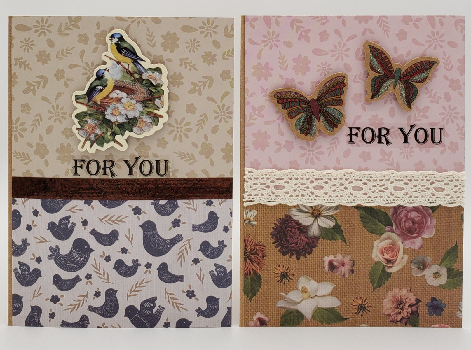 Cards by Crafted Paper Designs feature a mix of prints and solids on white (most common), cream, light pink, light blue, red, kraft or silver card. Our cards have unique decorations made of cardstock, chipboard, paper, wax, jewels, and other materials to create quality designs for every occasion. Included with every card is a matching envelope (based on card colour) and envelope seal. If needed, a card protector is also provided.