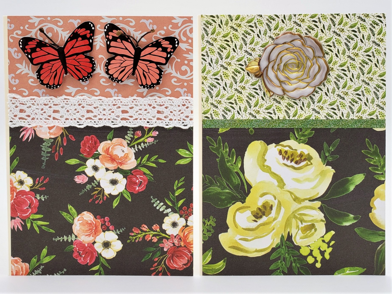 Cards by Crafted Paper Designs feature a mix of prints and solids on white (most common), cream, light pink, light blue, red, kraft or silver card. Our cards have unique decorations made of cardstock, chipboard, paper, wax, jewels, and other materials to create quality designs for every occasion. Included with every card is a matching envelope (based on card colour) and envelope seal. If needed, a card protector is also provided.